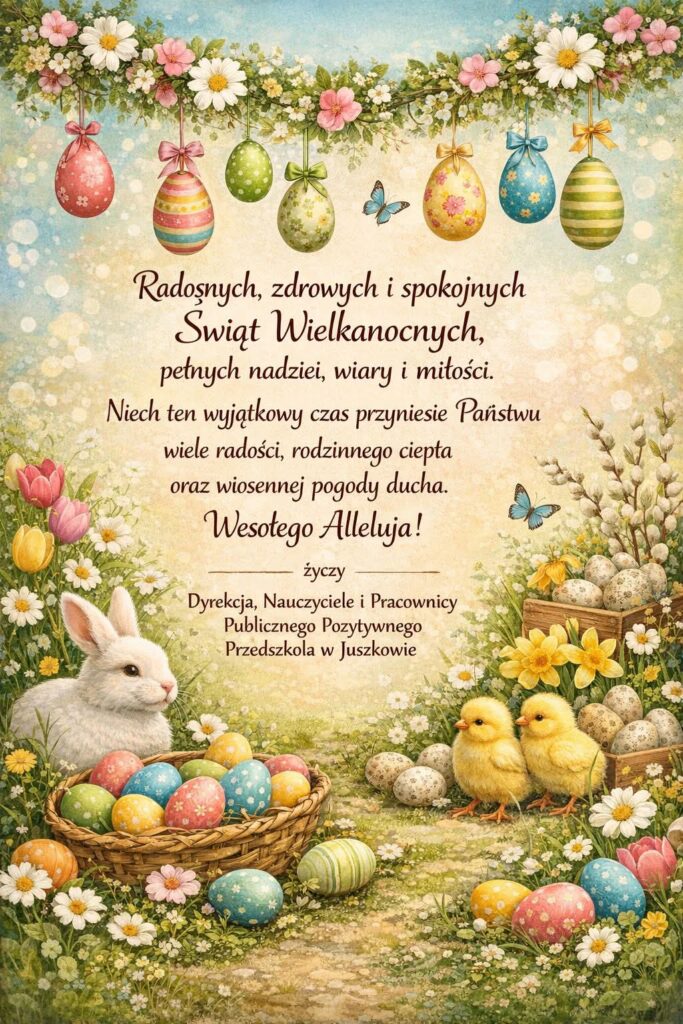 Życzenia 3 kwietnia 2026 Pełnych ciepła, spokoju i radości Świąt Wielkanocnych. Życzy Dyrekcja, Nauczyciela oraz Pracownicy Publicznego Pozytywnego Przedszkola w Juszkowie.